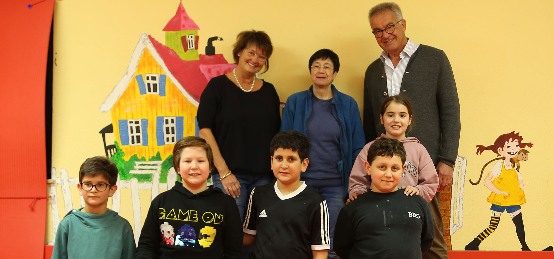 Susi Reifenhäuser, Jutta Höhmann (Pädagogin GHOST), Klaus Reifenhäuser und glückliche Kinder im Kletterraum des GHOST e. V. (v.l.n.r.)