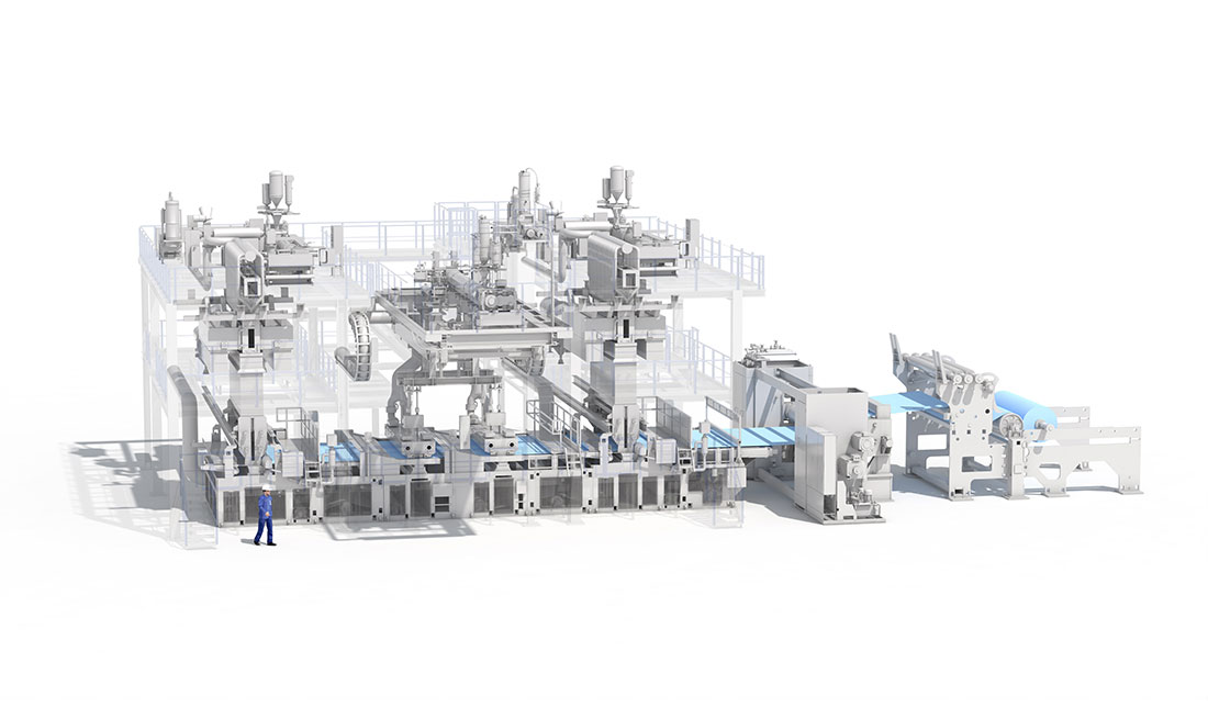 Wird die Composite-Anlage mit zwei Wicklern betrieben, können reine Meltblown-Vliese (Filtermedium in Atemschutzmasken) und SMS-Produkte (medizinische Schutzkleidung) oder reines Spinnvlies (Außen- und Innenschicht in Atemschutzmasken) zeitgleich hergestellt werden.